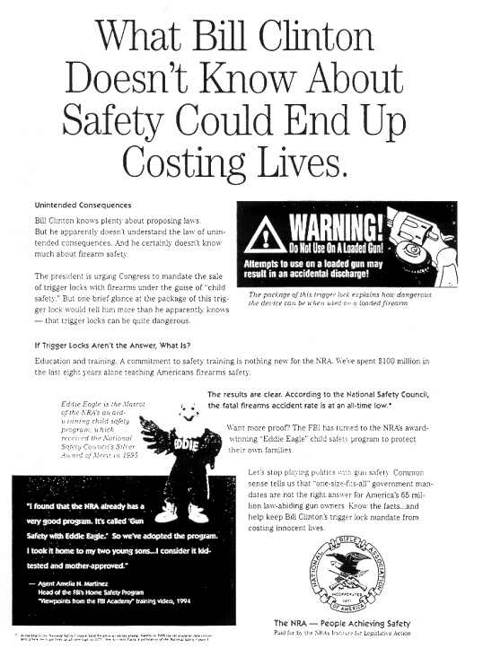 The Eddie Eagle amendment was used as a political tool to prevent debate of the CAP bill from occurring in the Indiana House of Representatives. The original CAP bill would have placed the responsibility for safe storage of handguns on the adult owner. The NRA-backed amendment relieved the owner of the obligation to properly store handguns and instead mandated Eddie Eagle classes for Indiana schoolchildren. By recommending gun safety classes for children instead of requiring safe storage of handguns, the burden of safety was inappropriately placed on the children themselves.Three months later, the NRA once again enlisted Eddie Eagle in an attempt to kill child safety legislation, this time in the U.S. Congress. In May 1997 the NRA placed full-page ads in two publications influential on Capitol Hill, Roll Call and CQ Monitor. The ads attacked legislation that would require that all handguns sold by gun dealers be sold with trigger locks. The full-page ads were timed to coincide with expected committee action on the trigger lock proposal. The ads featured Eddie Eagle, "the Mascot of the NRA's award-winning child safety program, which received the National Safety Council's Silver Award of Merit in 1995." It warned that "trigger locks can be quite dangerous" and attacked proposed laws such as the trigger lock bill as "`one-size-fits-all' government mandates." The answer, the ad stated, was in "education and training" programs like Eddie Eagle.