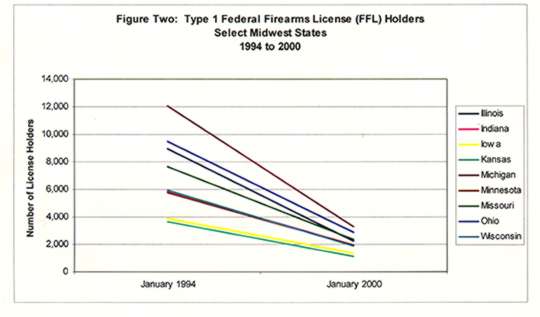 Less Gun Dealers, Less CrimeThe Drop in Federally Licensed Firearms Dealers in the MidwestSection Four: The Drop in Gun DealersAs a result of the new licensing requirements and ATF's increased scrutiny of licensees, the number of Type 1 FFLs in the United States has dropped 72 percent�from 245,628 in 1994 to 69,591 in 2000. In the Midwest, the number of dealers has dropped 70 percent, from 63,219 to 19,076. Illinois led the region with a 75 percent reduction, while Michigan was first in terms of number decrease of FFLs with 8,782.7 For information on all midwestern states, see Figures One and Two. Figure One: Number and Percent Decrease of Type 1 FFLs in the Midwest, January 1994 to January 2000