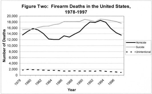 The industry has heavily promoted pocket rockets in connection with a wave of new or revised state laws that permit licensed persons to carry concealed firearms.6 Pocket rockets are a prime example of how the firearms industry has exploited increased lethality�greater killing power�over the last several decades to boost sales in its saturated markets.7 In those same decades, firearms, especially handguns, have inflicted a torrent of death and injury on Americans. (See Figure Two.) In 1997 (the latest year for which complete data are available) 32,436 Americans died of firearm injuries.8 Suicides accounted for the majority of those deaths (17,566). Since 1978 suicide has been the largest category of firearms fatality. (The use of a firearm greatly increases the chance of success in a suicide attempt.) Homicides consistently rank second in firearm deaths and handguns consistently account for about 70 percent of firearm homicides in the United States. This carnage inflicts incalculable human anguish and imposes a substantial burden on the nation's health care system. On average, the medical cost of each gunshot injury is about $17,000 and taxpayers end up paying for 49 percent of the lifetime costs of those injuries.9